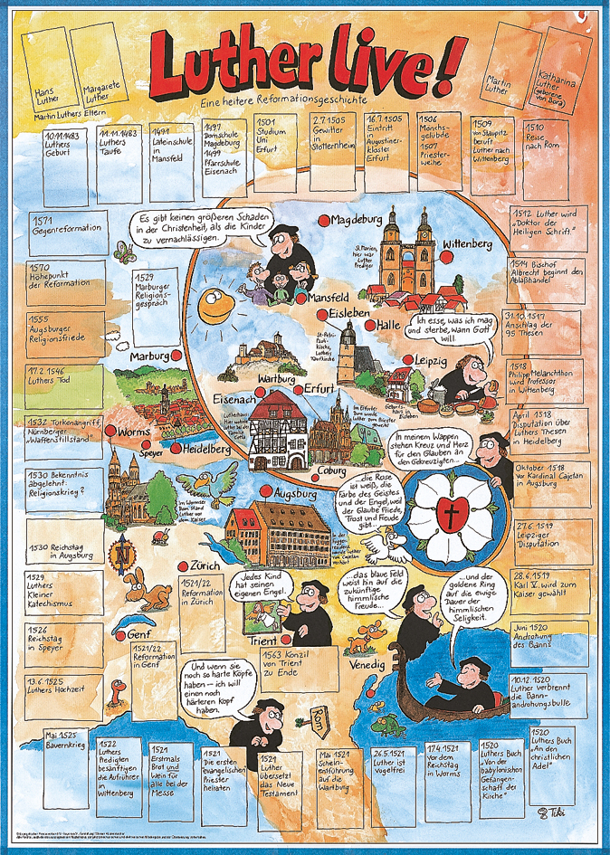 Luther live erleben ganz einfach: Das Einzelposter, gestaltet von Werner Tiki Küstenmacher, vermittelt zentrale Figuren und Stationen der Reformationsgeschichte auf kreative Weise – ideal für den Einsatz im Unterricht, Gemeinderaum oder Kinderzimmer.